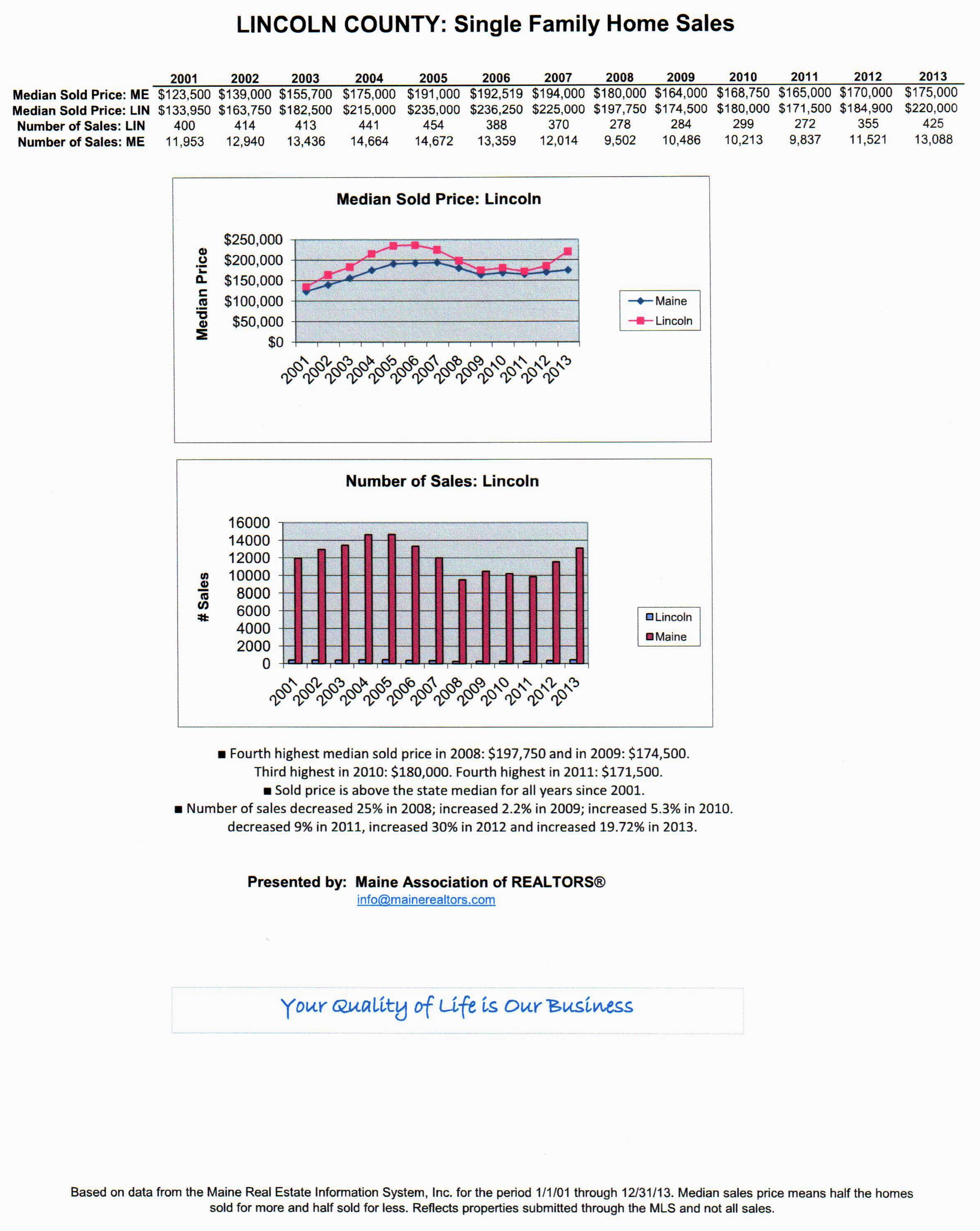 Often, we get asked, “How’s the market?” The Maine Association of REALTORS® compiles historical data and the graph below tells the story of where we’ve been since 2001 as far as single family home sales in Lincoln County. You can see that in 2013, we still had not gained back all of the value that was lost in the aftermath of the 2008 crash and subsequent recession. The climb back has been slow and sometimes, faltering, but it appears that Lincoln County returned to its pre-recession position relative to the State median sold price in 2013, and that’s good news!